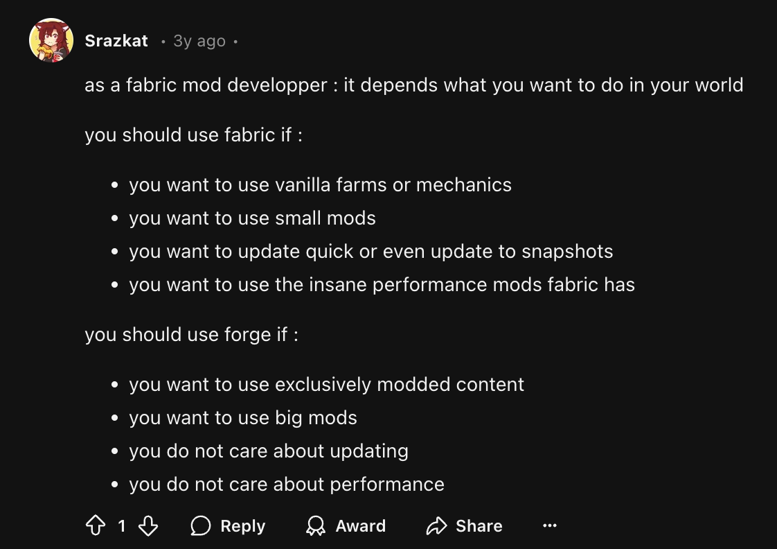 - ok so i should probably go with fabric if im not reverse engineering minerl or malmo (latest versions, top performance, modularity, works across all OSes)
